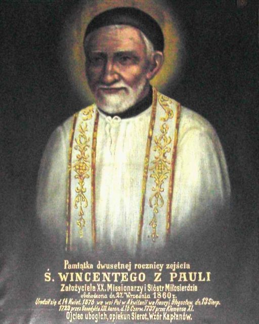 Vincent de Paul, cassock, surplice, stole, skullcap, halo; characterized as "Father of the poor, guardian of orphans, example for priests".
