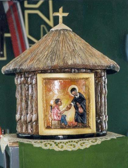 Vincent de Paul, holding a water gourd, distributes food to a seated African man. Door of a ceramic tabernacle, locally made; original in DePaul Center, Nairobi, Kenya.