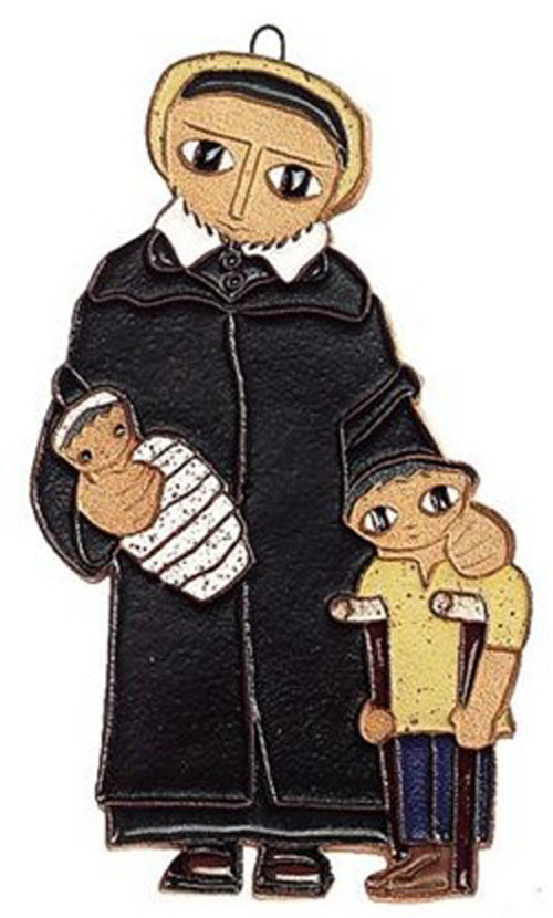 Painted ceramic plaque; Vincent de Paul, standing, cassock, mantle, skullcap, with two children (one with crutches); artist: Fr. Maur van Doorslaer, OSB, St. Andrew's Abbey, Valyermo, CA