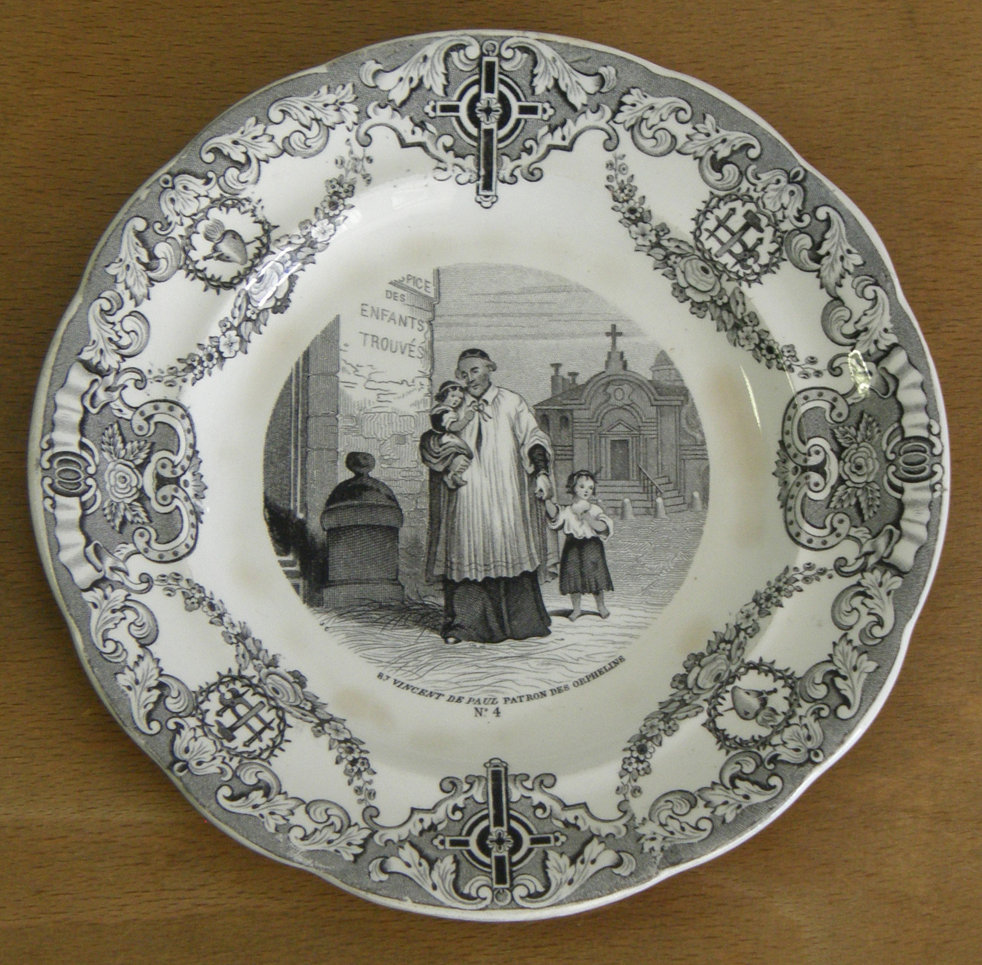 Porcelain plate, monochrone grey; Vincent de Paul, standing, cassock, surplice, skullcap, with foundlings before Foundling Hospital; original in Vincentian mother house archives, Paris; another copy at DePaul University
