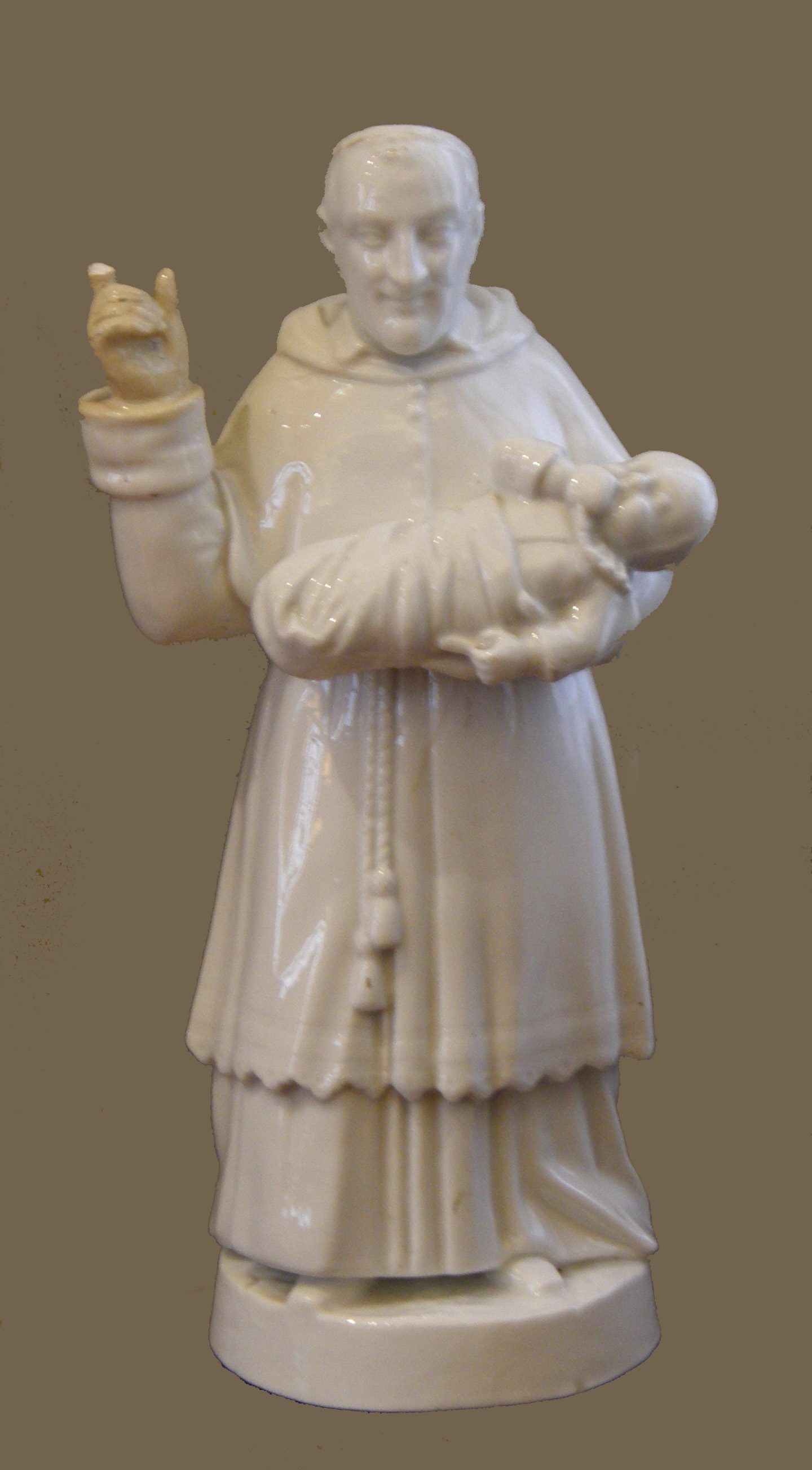 Front, Vincent de Paul, standing, cassock, surplice, short cape, holding infant; white glazed porcelain; original in Vincentian mother house