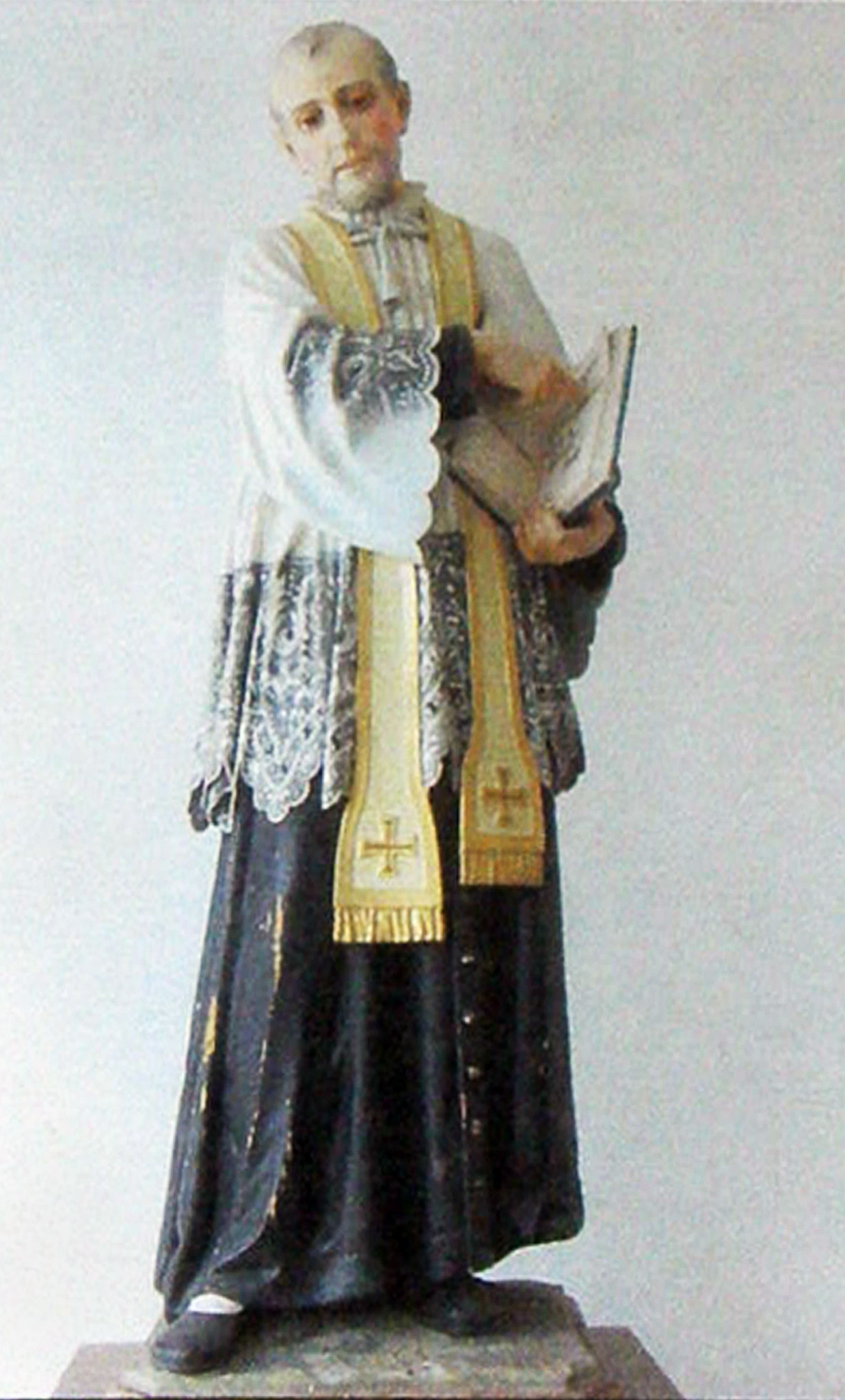 Painted wood statue; Vincent de Paul, standing, cassock, surplice, gold stole, no skullcap, gesturing to open book; location of original unknown