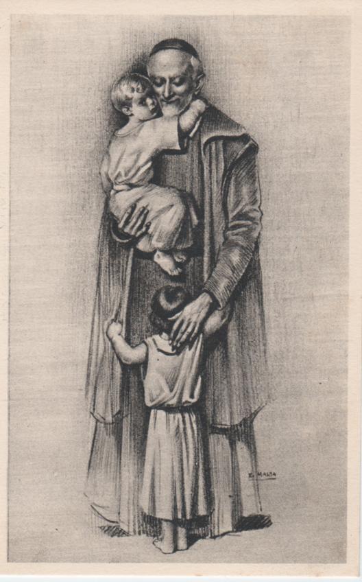 Drawing; Vincent de Paul, standing, cassock, short mantle, skullcap; with two children; original in Portuguese province archives, Lisbon