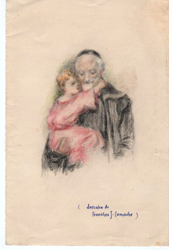 Drawing by Francisco J. Camacho; Vincent de Paul, cassock, mantle, skullcap, holding one child; original in Vincentian provincial archives, Lisbon