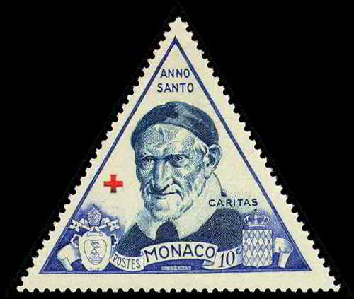 Vincent de Paul, cassock, skullcap, seals of Monaco and Vatican City, Red Cross, Charity for Holy Year, 1950; triangular issue