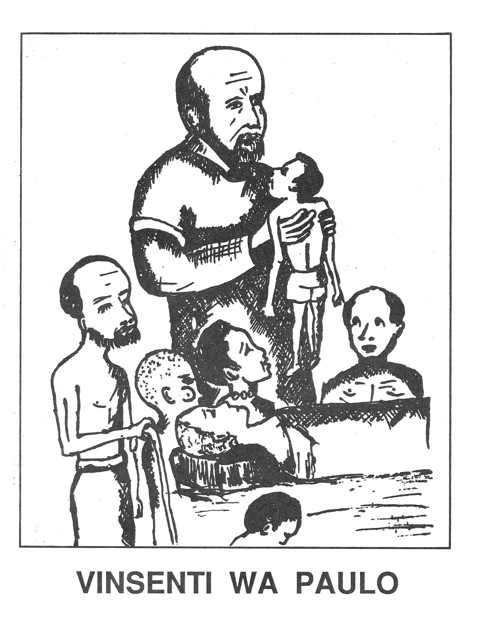 Author: Alkuin Bundschuh, OSB; Book cover, Swahili form of name; Vincent de Paul with poor and sick; Tanzania, 1980