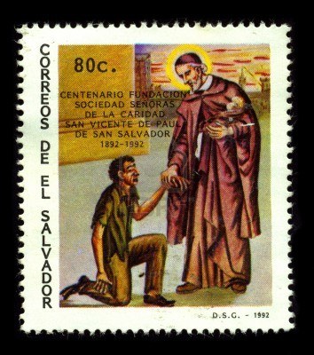 Vincent de Paul, standing, cassock, cape, skullcap, with child, helping poor man; centennial of foundation of Ladies of Charity in El Salvador, 1892-1992