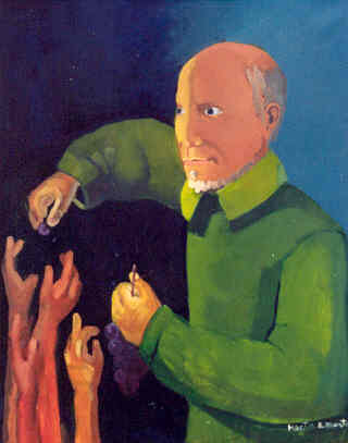 Painting, Vincent de Paul, standing, green cassock, distributing food (from bunch of grapes) to outstretched arms and hands; original in Dominican Republic