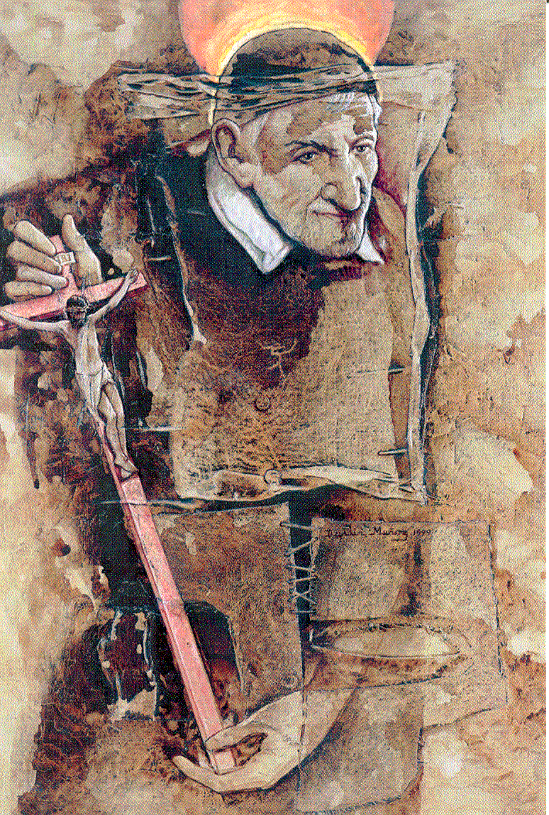 Painting; Vincent de Paul presenting crucifix, by Dustin Muñoz, 1999; original in Dominican Republic