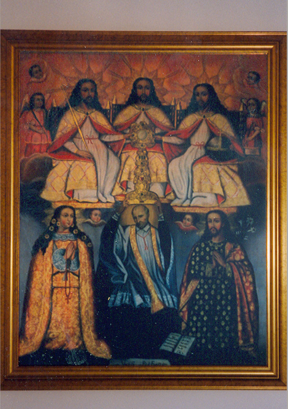 Painting, figure of Vincent de Paul added, cassock, surplice, gold stole, supporting monstrance and host; Trinity above with angels; John Baptist, and Rose of Lima (?) at his side; original in San Juan, Puerto Rico