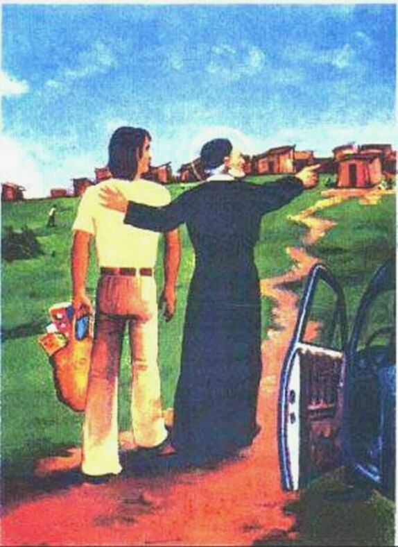 Painting (illustration?); Vincent de Paul, cassock, skullcap, from behind, shows young man with bag of food, to houses of poor; open automobile door; location of original unknown