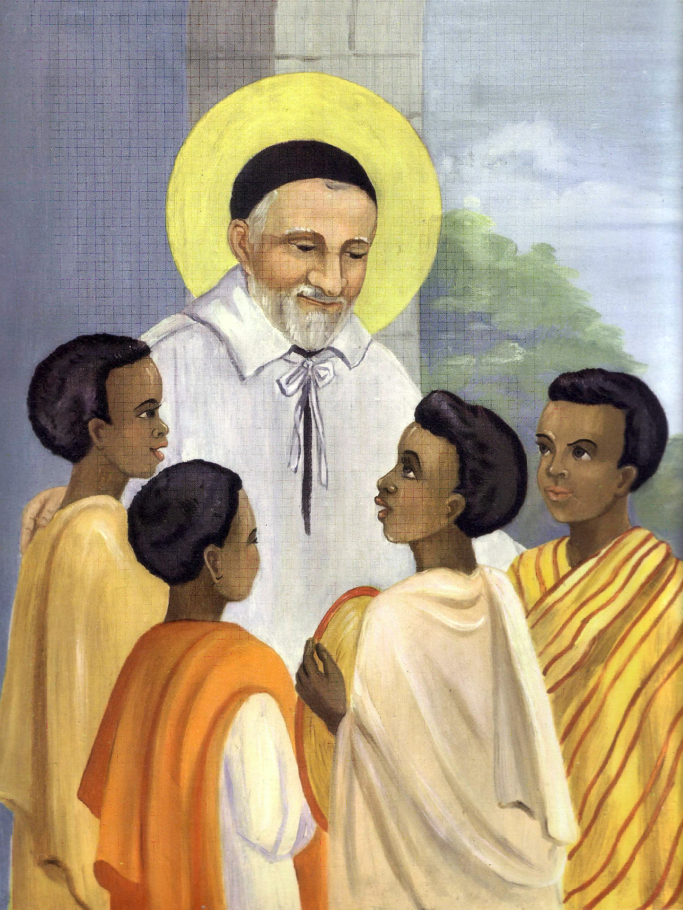 Vincent de Paul, standing, cassock, surplice, skullcap, halo; with four boys from Madagascar, brought to St. Lazare, January 1655; original drawing in Madagascar (courtesy Fr. Gaston Faratsely, CM)