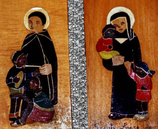 Vincent de Paul, standing, cassock, cape, skullcap, halo; Louise de Marillac, standing, habit, halo; with Haitian children; original in Vincentian house, Port-au-Prince