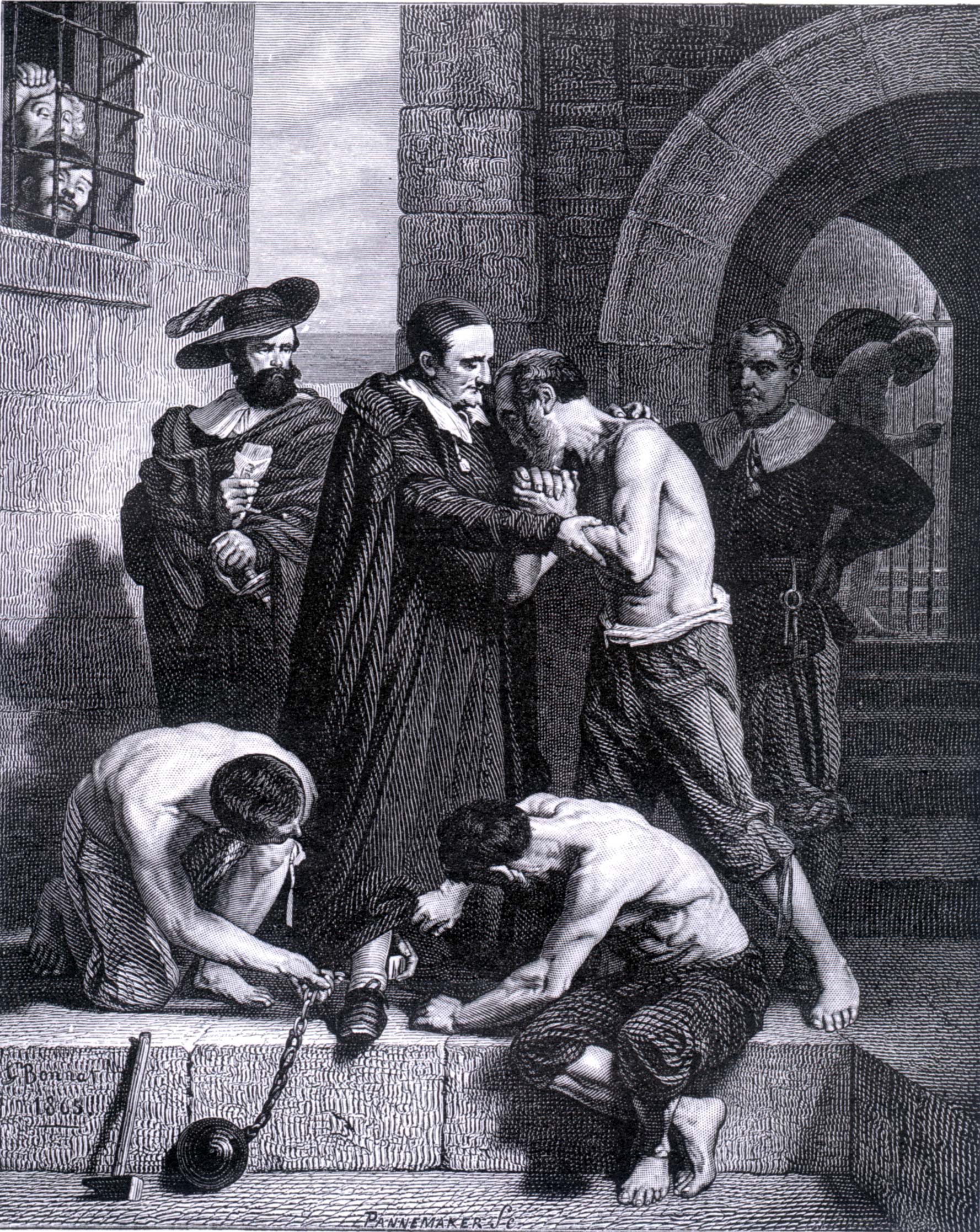 Engraving of painting by Bonnat, Vincent de Paul taking chains of galley convict; original painting in Paris