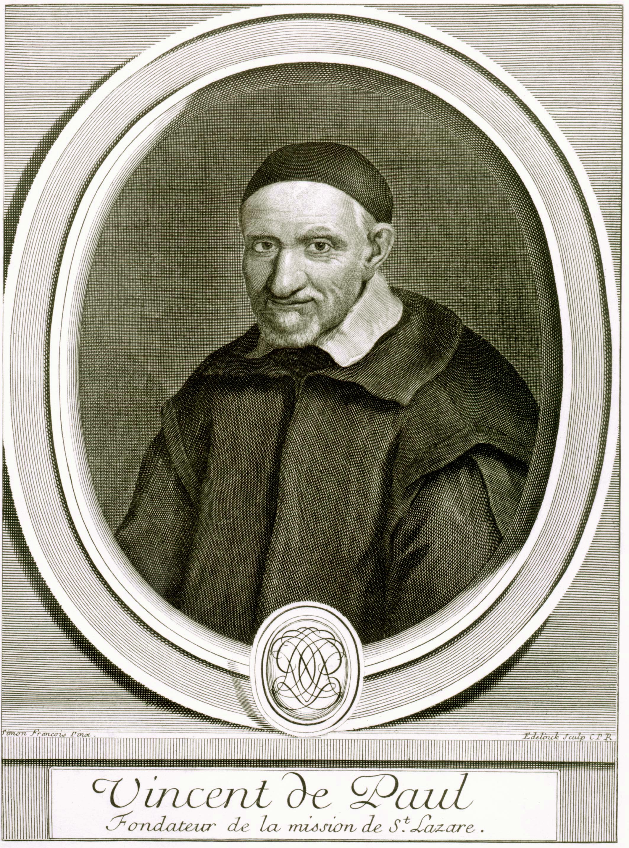 Engraving; Vincent de Paul, cassock, mantle, skullcap; oval frame; work of Gerard Edelinck, 1700