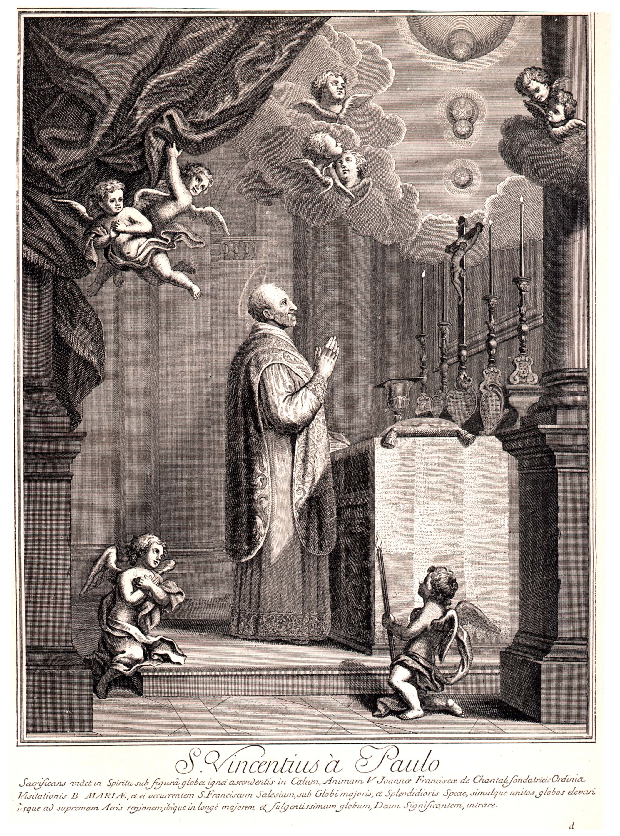 St. Vincent de Paul, priestly vestments, angels as acolytes; vision of globes; Latin text; artist, Gaetan Sontin; not one of the original 11 canvases