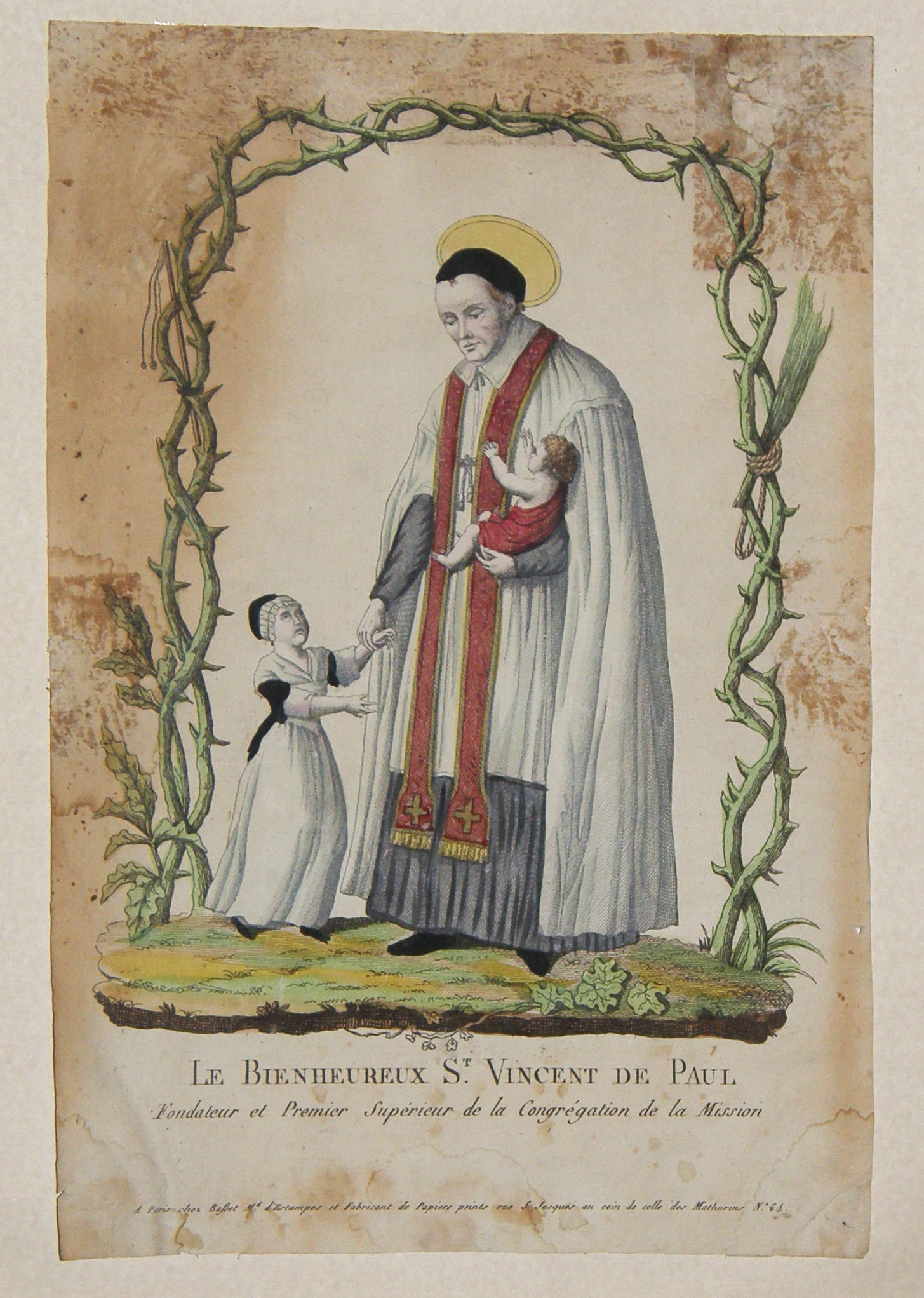 Vincent de Paul, standing, cassock, ample surplice, red stole, skullcap, halo, with two children; thornbush arbor as framework; Vincentian motherhouse museum, Paris