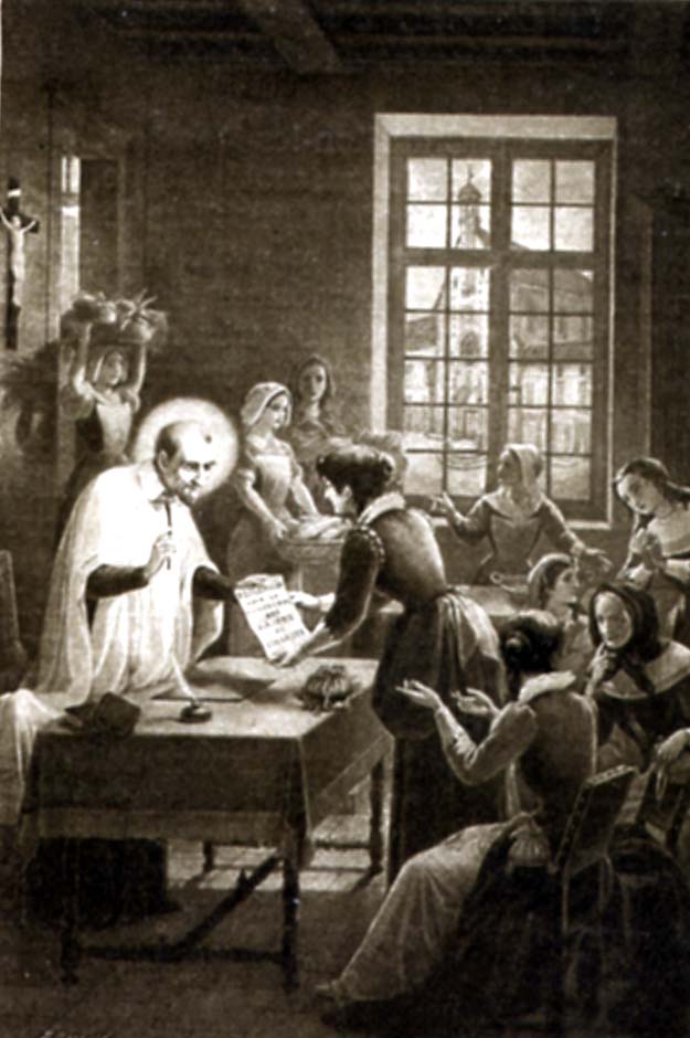 Vincent de Paul, standing, cassock, surplice, halo; Ladies; begging bag on table, scroll with rules; Chatillon parish church visible through windows; location of original unknown; courtesy, C. Lautissier