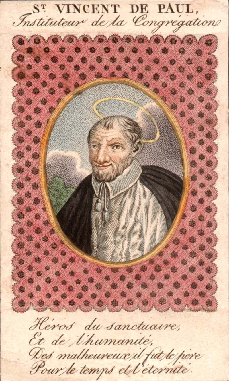 French text: Founder of the Congregation, hero of the sanctuary and of humanity; he was the father of the unfortunate for time and eternity; hand colored, original in Vincentian motherhouse, Paris