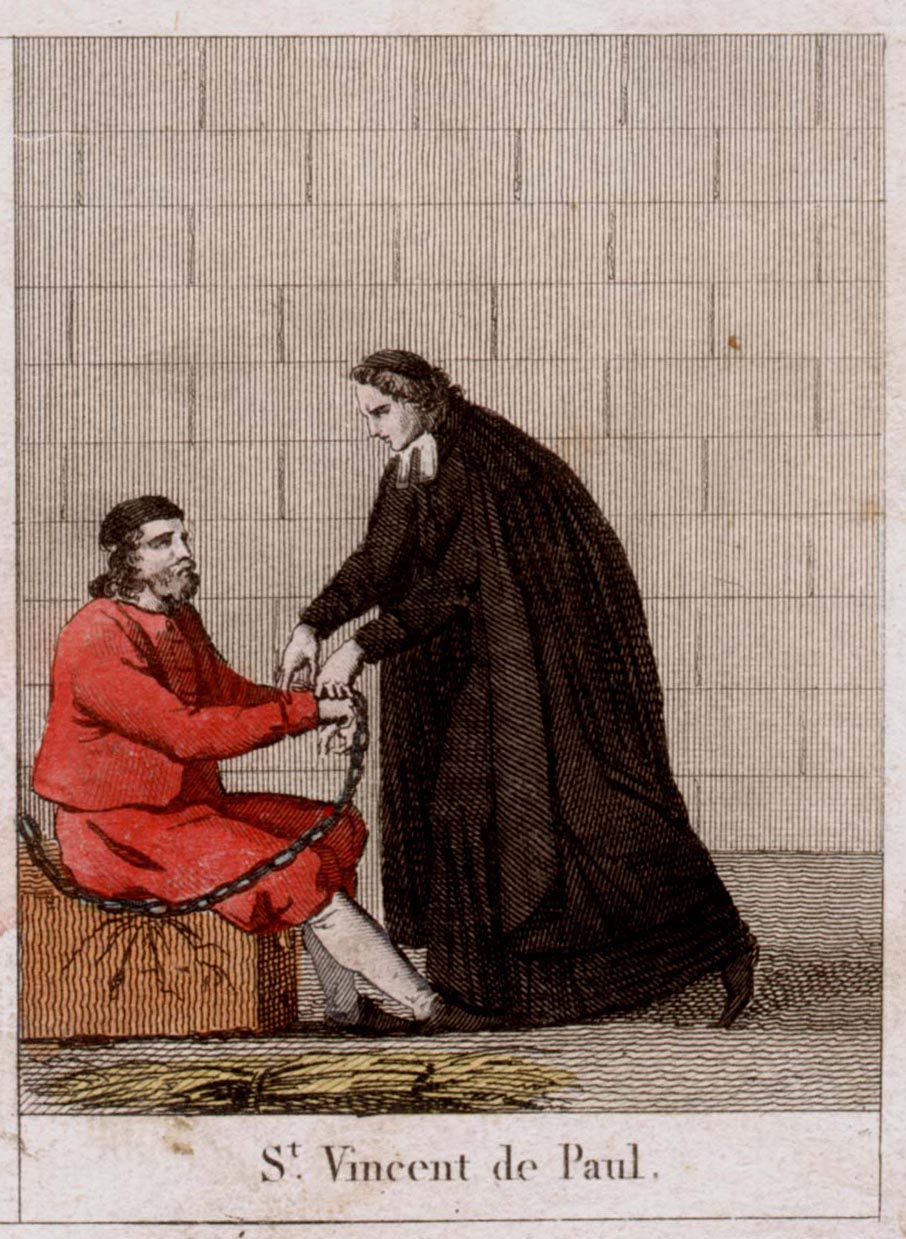 Vincent de Paul, standing, cassock, cape, collar of diocesan clergy, skullcap; with prisoner; hand colored; original in Vincentian motherhouse, Paris