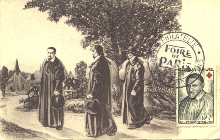 Vincent de Paul and missioners approaching village for a mission; cassock, mantle, skullcap, hats; 1960 commemorative postage stamp of tercentenary of death