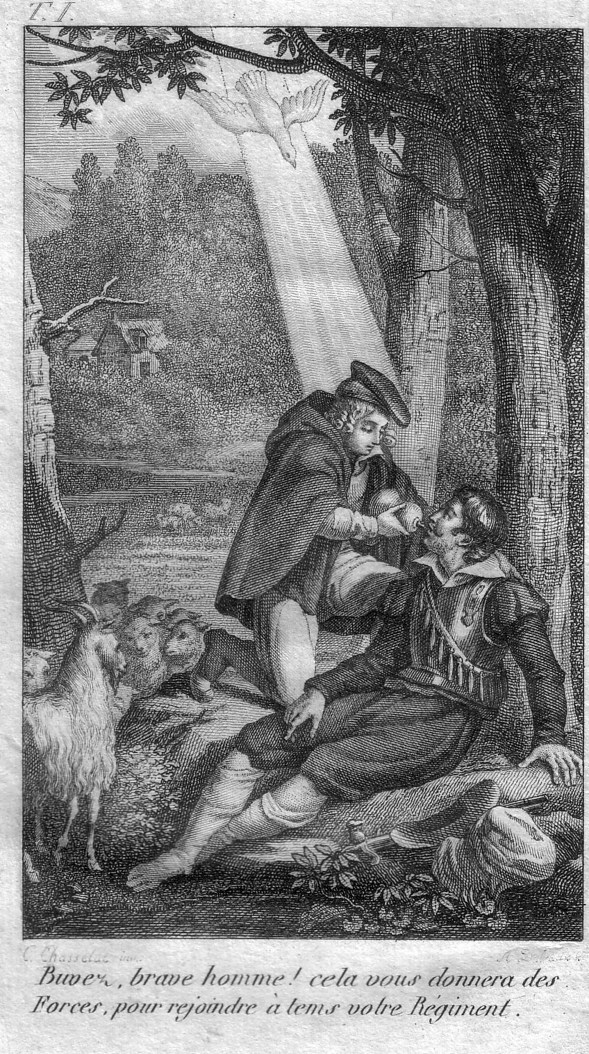 "Drink, brave man; this will give you the strength to rejoin your regiment on time." Vincent de Paul, shepherd's clothing; dove of Holy Spirit; wounded soldier; sheep in woods, house in background