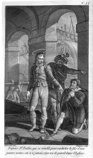 "Since St. Paulinus, who was sold to ransum the son of a poor widow, there has neven been the equal in the Church." Vincent de Paul, lay clothes, halo, ball and chain