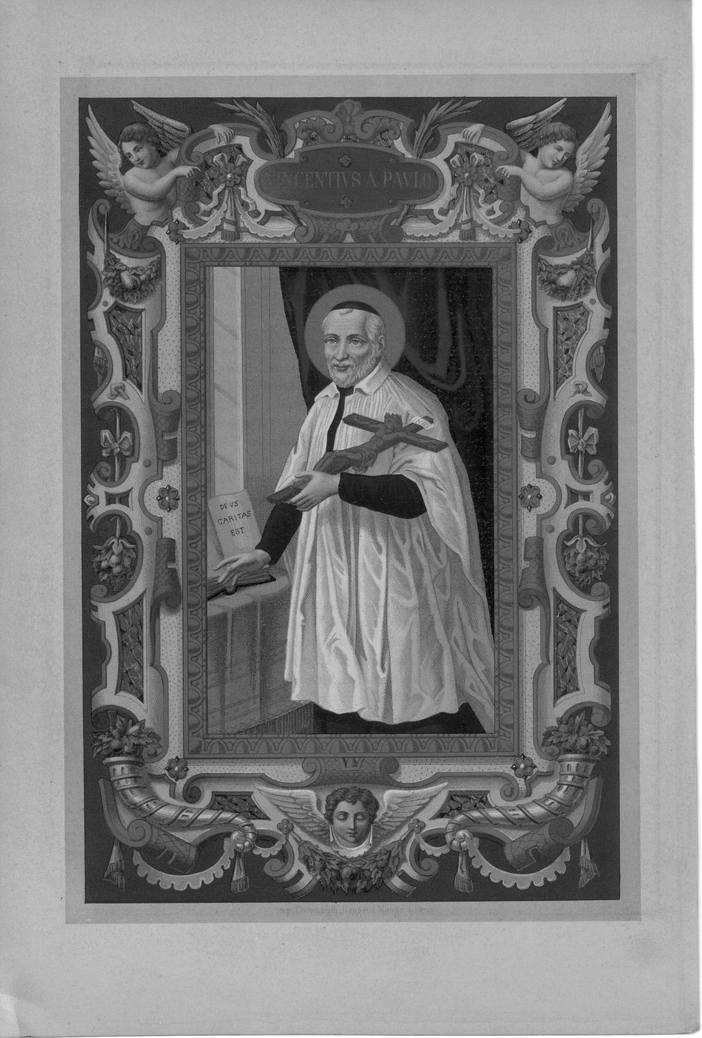 Black and white version of colored image; Vincent de Paul, cassock, surplice, skullcap, presenting crucifix