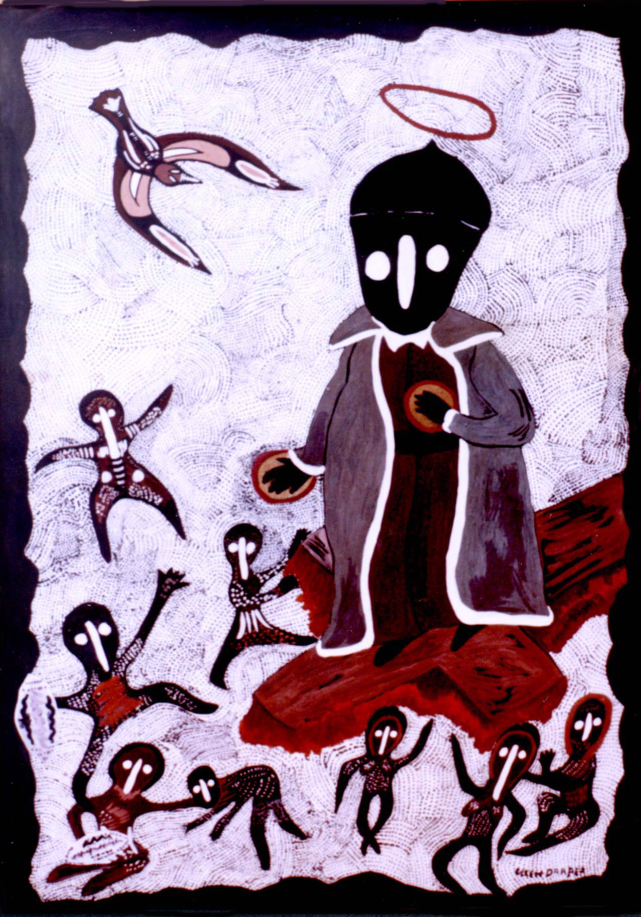 Oil painting, Vincent de Paul, standing on cross, with eight figures below; Australian aboriginal style, signed by artist, Eileen Draper. Original in General Curia, Rome