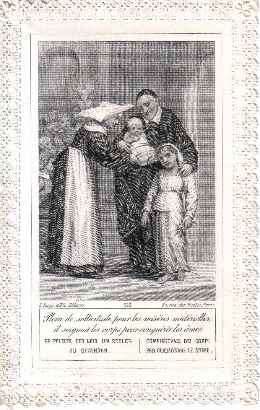 Text in French, German, Italian. Text: Full of care for material miseries, he cared for bodies to conquer souls