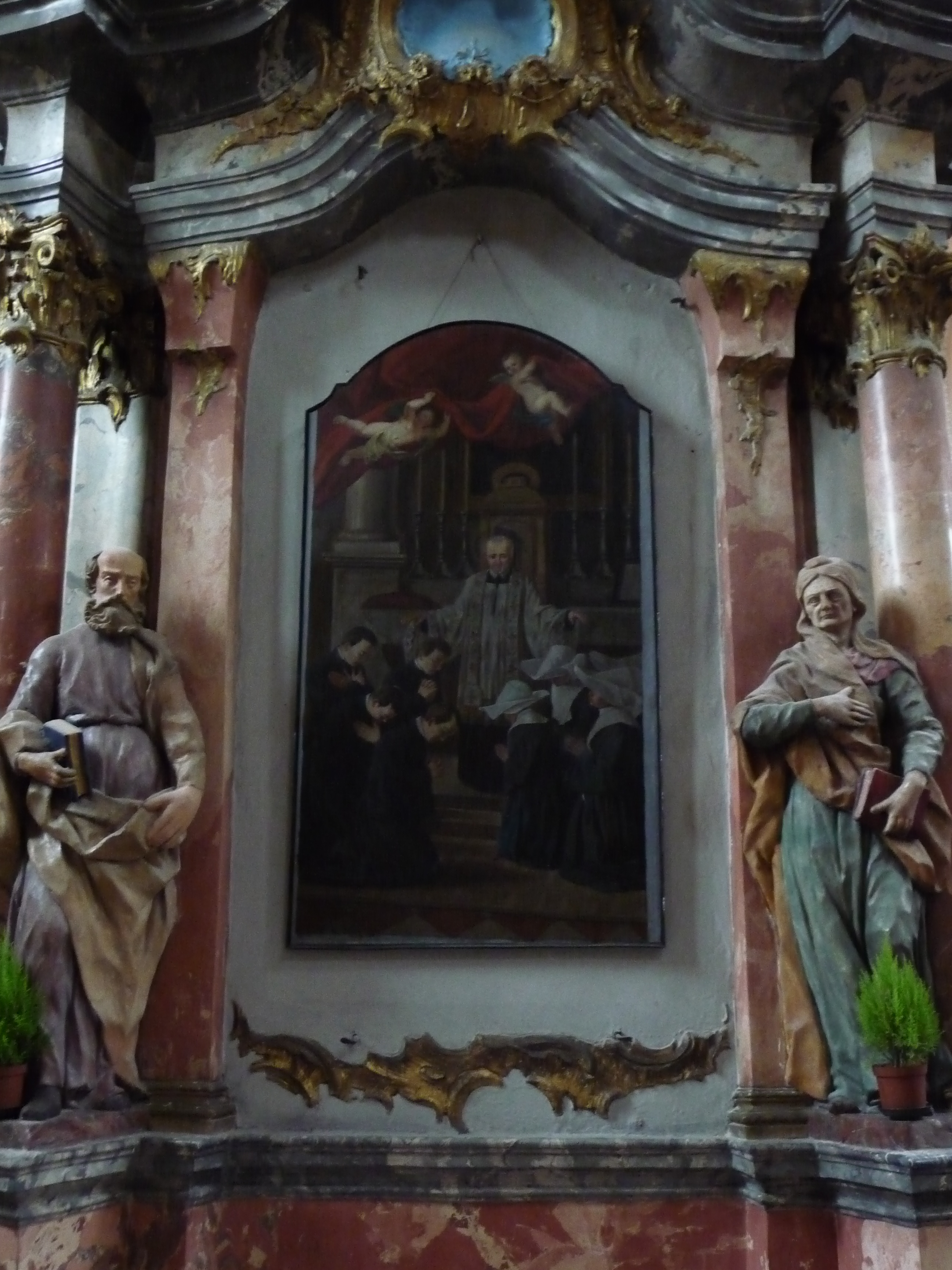 Oil on canvas; Vincent de Paul, standing before altar in cassock, surplice, stole; Vincentians and Daughters of Charity (19th century habit) kneeling on altar steps; angels above. Courtesy of James Murphy, CM