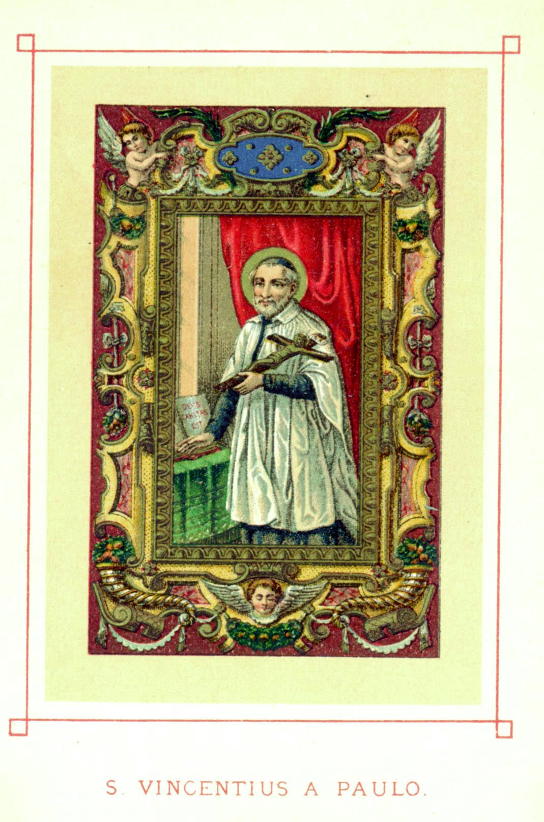 Vincent de Paul, standing, cassock, surplice, skullcap, halo; holding crucifix; book illustration; Latin form of his name
