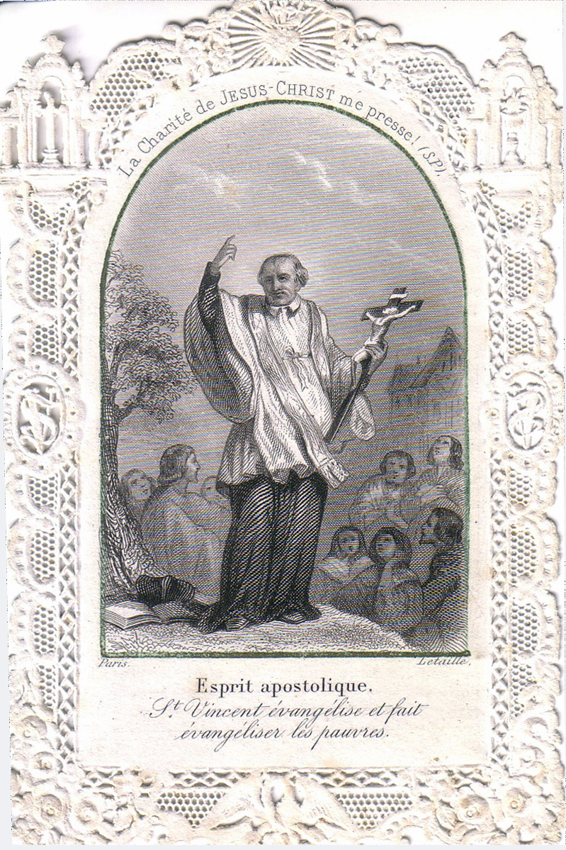 Based on Italian model prepared for his canonization; Text: Apostolic spirit. St. Vincent evangelizes and has the poor evangelized. (Above) The charity of Jesus Christ impels me.