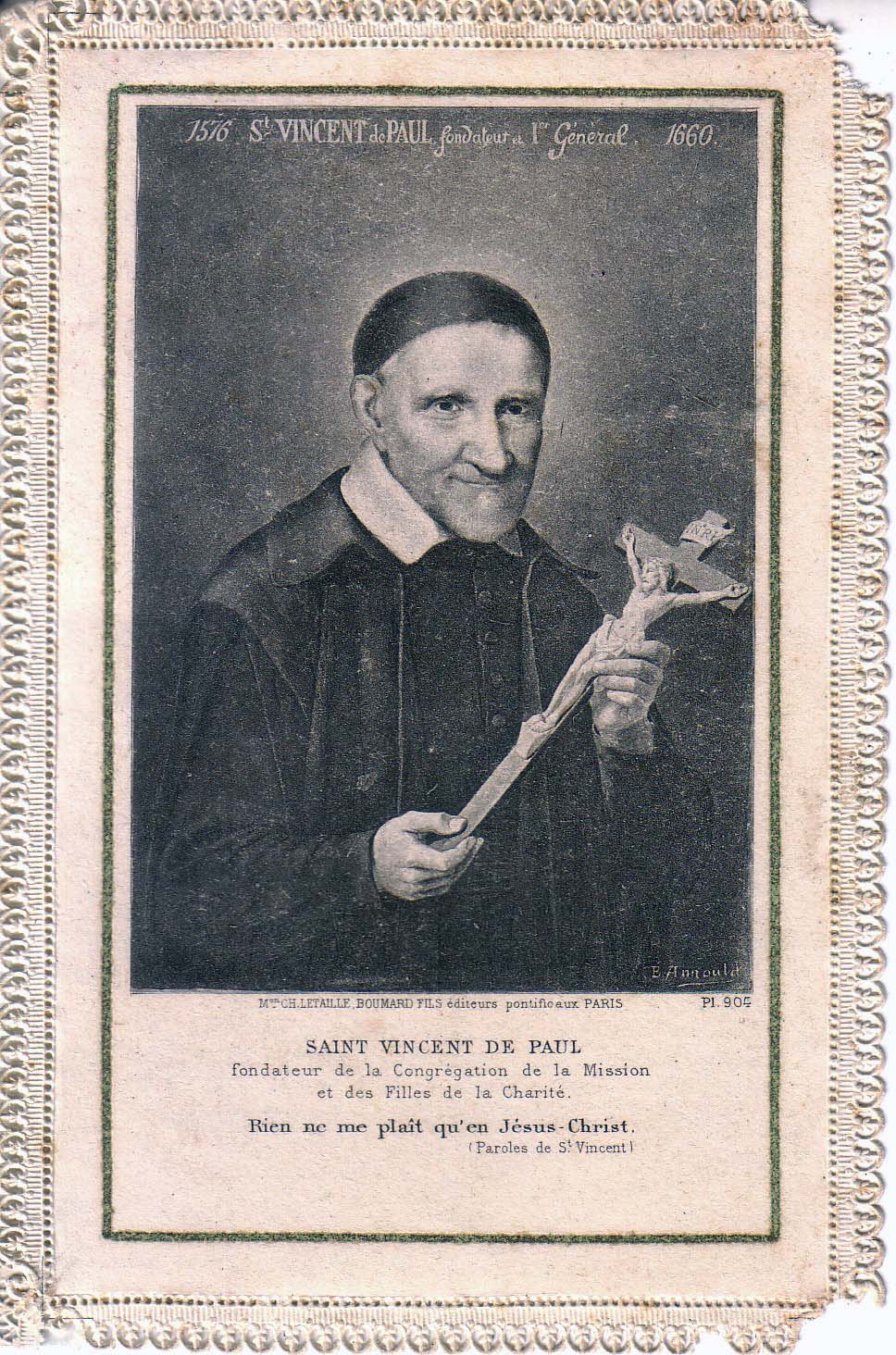 Text: SVdP, founder of the CM and the Daughters of Charity. "Nothing pleases me except in Jesus Christ." Artist: B. Arnould; photograph of a painting.