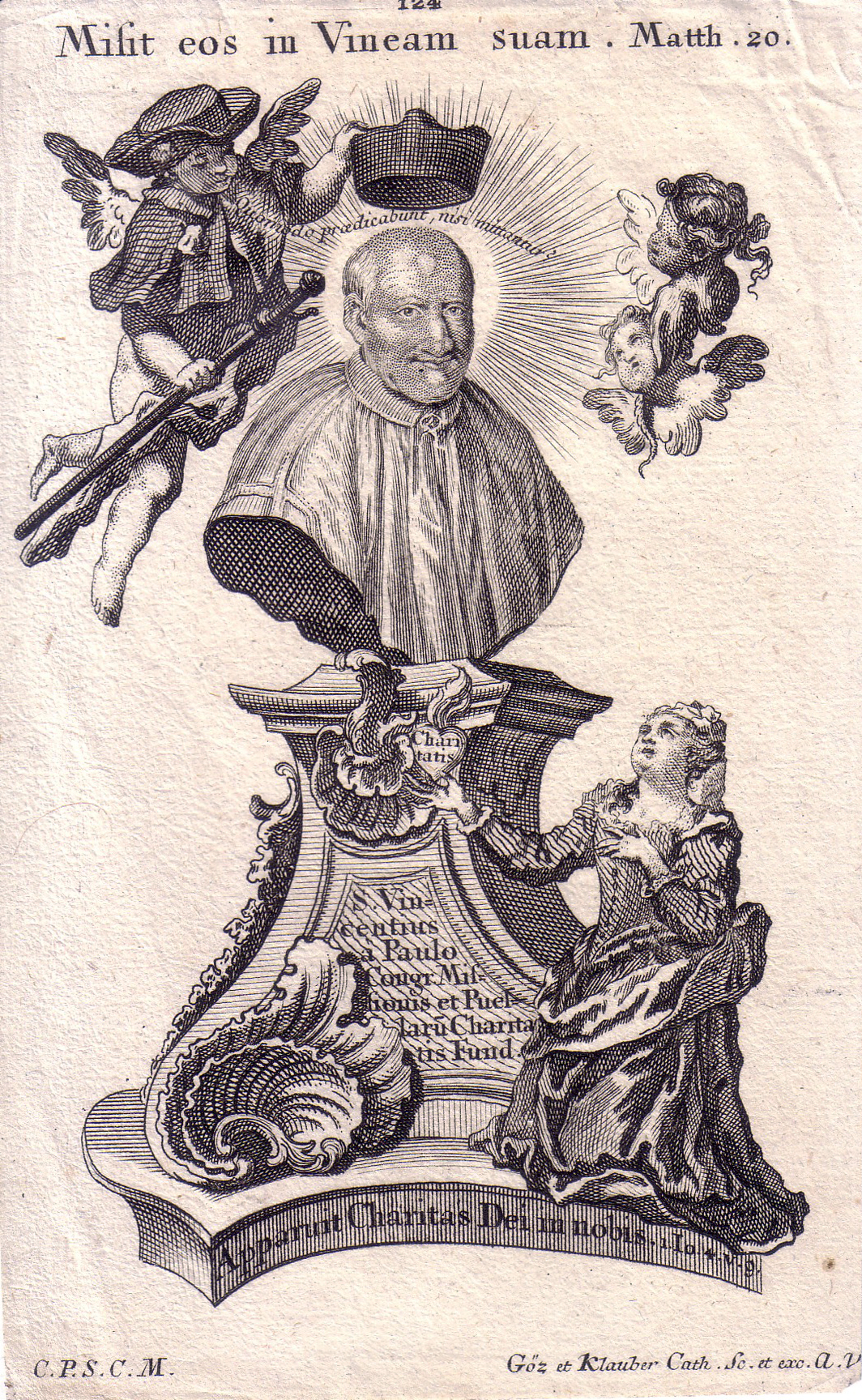 18th century; texts: He sent them into his vineyard; how will they preach unless they are sent?; St VdP, founder of the Congregation of the Mission and the Daughters of Charity; the love of God has appeared among us