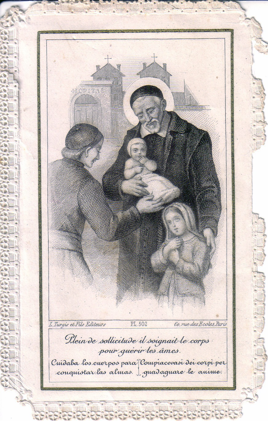 Texts in Spanish and Italian; Full of kindness, he cared for the body to heal souls