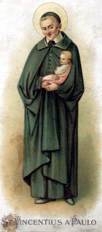 Vincent de Paul, standing, cassock, cape, skullcap, halo; holding child; internet image