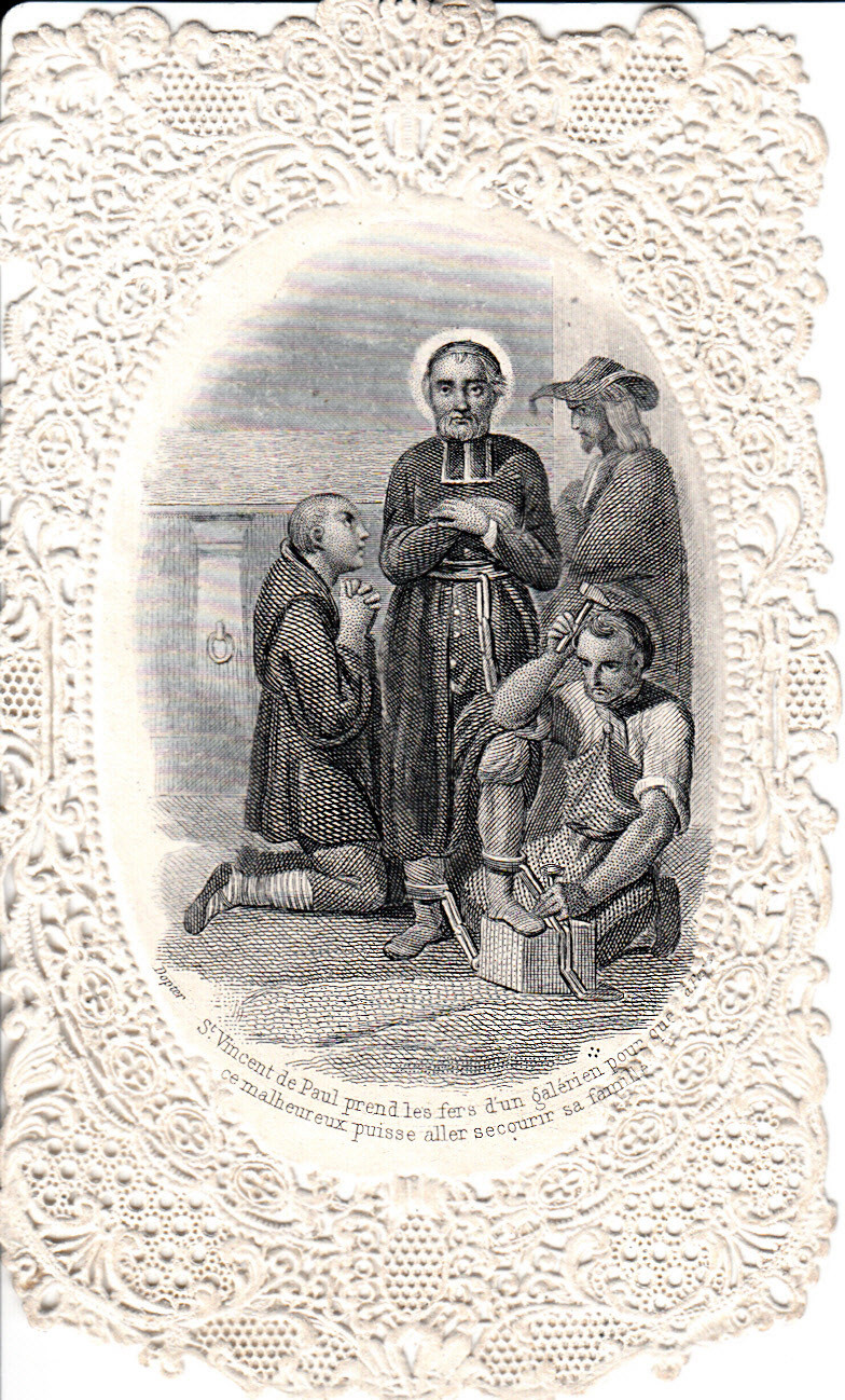 Text: SVdP takes the irons of a galley convict so that this unfortunate might go to help his family Vincent de Paul with diocesan clerical collar