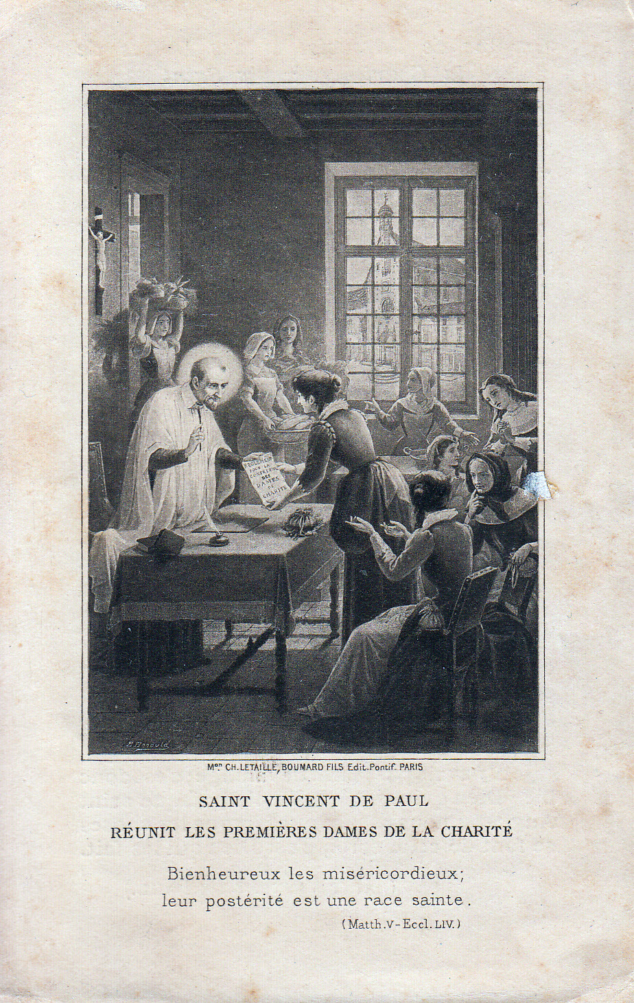 Image of parish church of Chatillon visible through window Text: Blessed are the merciful; their posterity will be a holy race (Mt 5, Eccl 54)
