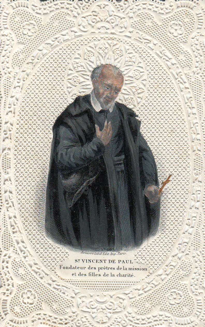 Text: Founder of the priests of the Mission and the Daughters of Charity Note hat under right arm