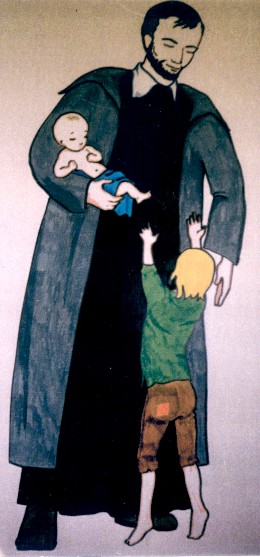Young Vincent de Paul, cassock, blue overcoat, halo; two children; material: painting, or cloth banner? Collection of Bro. Adam Budzyna, CM
