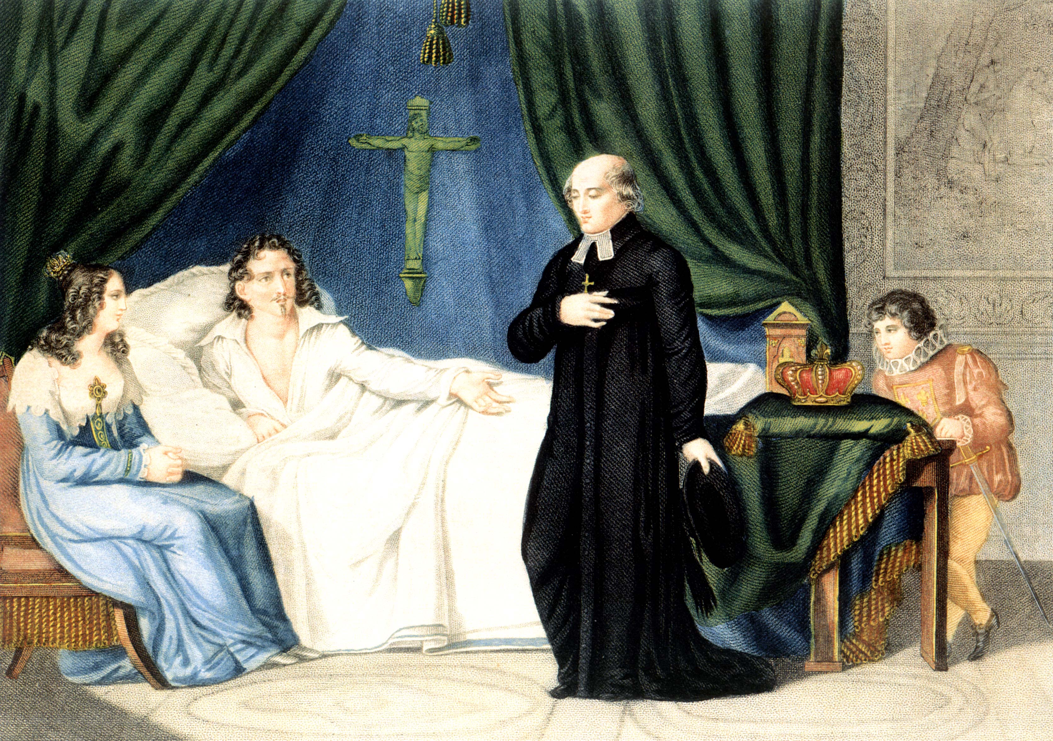 Colored lithograph; Vincent de Paul, standing, trailing cassock, no cincture, diocesan clerical collar, holding hat; Louis XIII, queen, Dauphin behind looking at crown; in Vincentian motherhouse, Paris