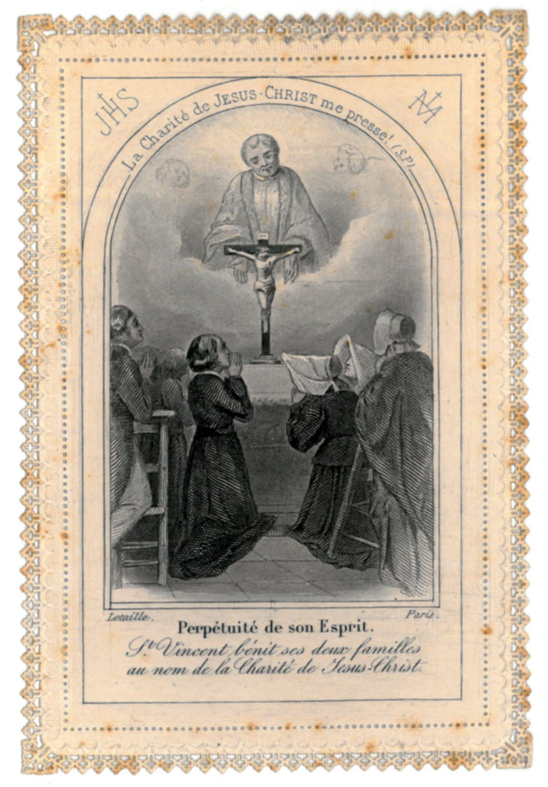 Text: SV blesses his two families in the name of the charity of Jesus Christ