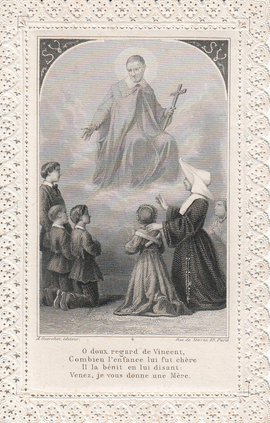 Text: O sweet face of Vincent / how dear you are to children / you blessed them by saying: / Come, I give you a mother [a Daughter of Charity]
