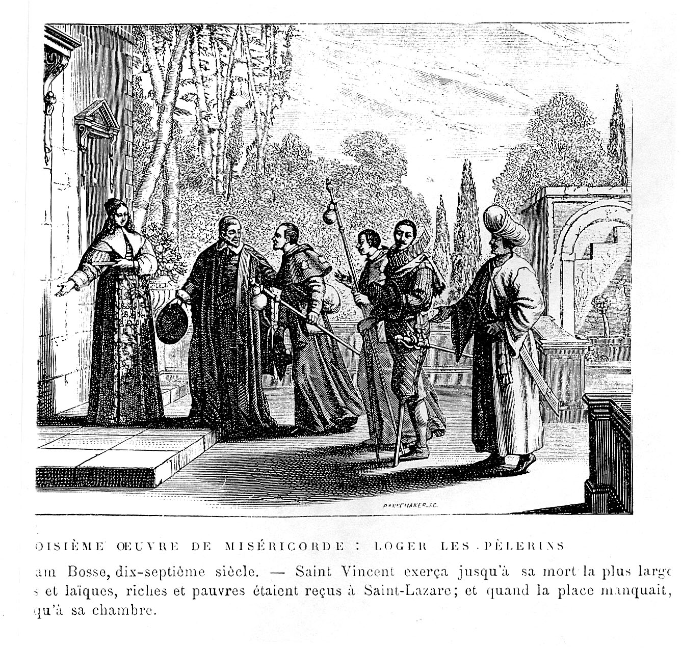Engraving by Abraham Bosse, in Arthur Loth (Mission Sociale), probably Vincent de Paul, lodging pilgrims going to Compostela, woman, others, Turk;