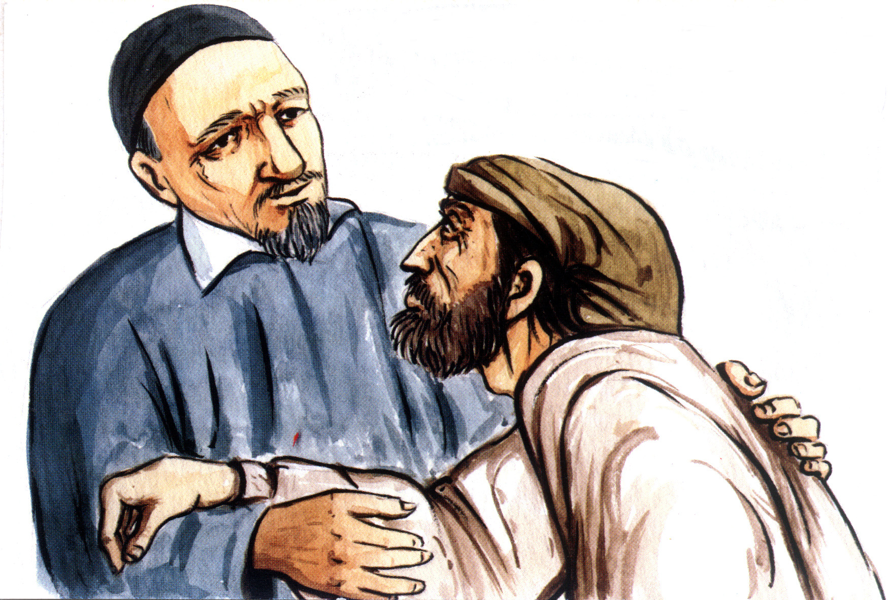Watercolor, prepared for Society of St. Vincent de Paul, Rennes; Vincent de Paul comforting a poor man