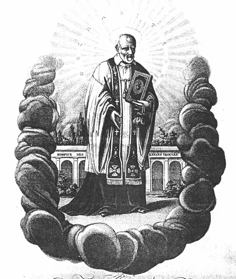 Vincent de Paul, standing, long cassock, surplice, stole, halo; holding book, begging bag; before colonnade of Hospice of the Foundlings; rays with word Charity above; clouds below; Vincentian motherhouse, Paul Gunth collection