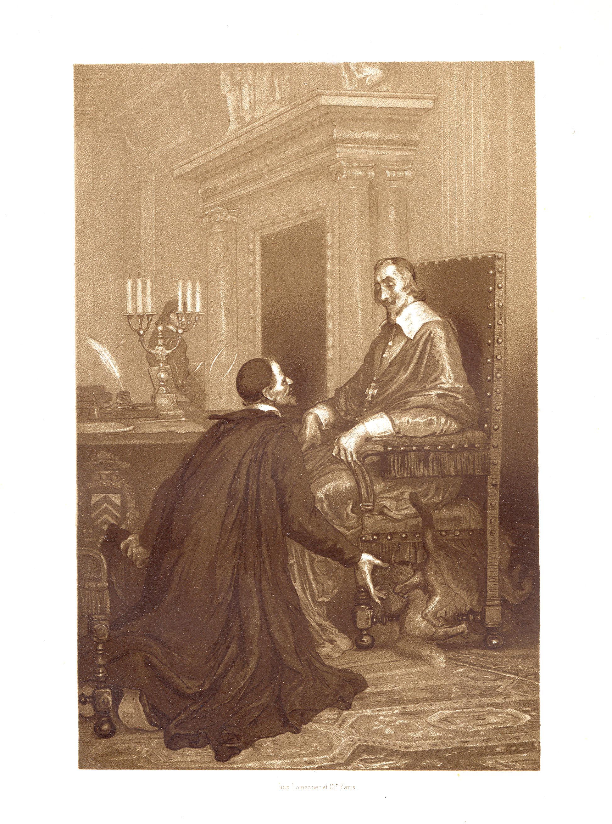 Chromolithograph; Vincent de Paul, Richelieu, cats below cardinal's chair; work of Lafon