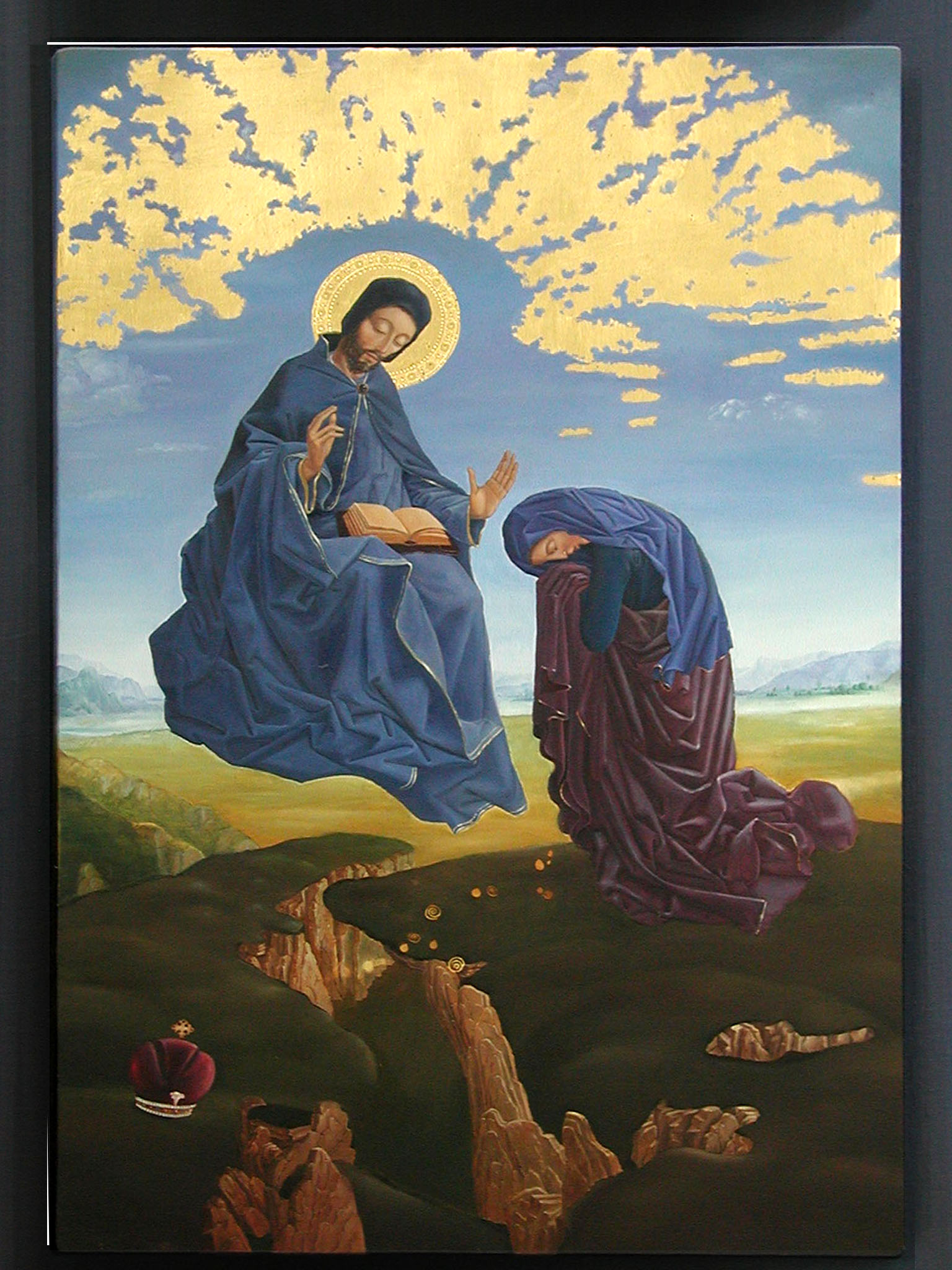 Altar piece detail; Vincent de Paul, blue garments, book in his lap, instructing Louise de Marillac; her crown of noble birth on the ground; Vincentian parish, Bratislava Artist: Jozef Baus