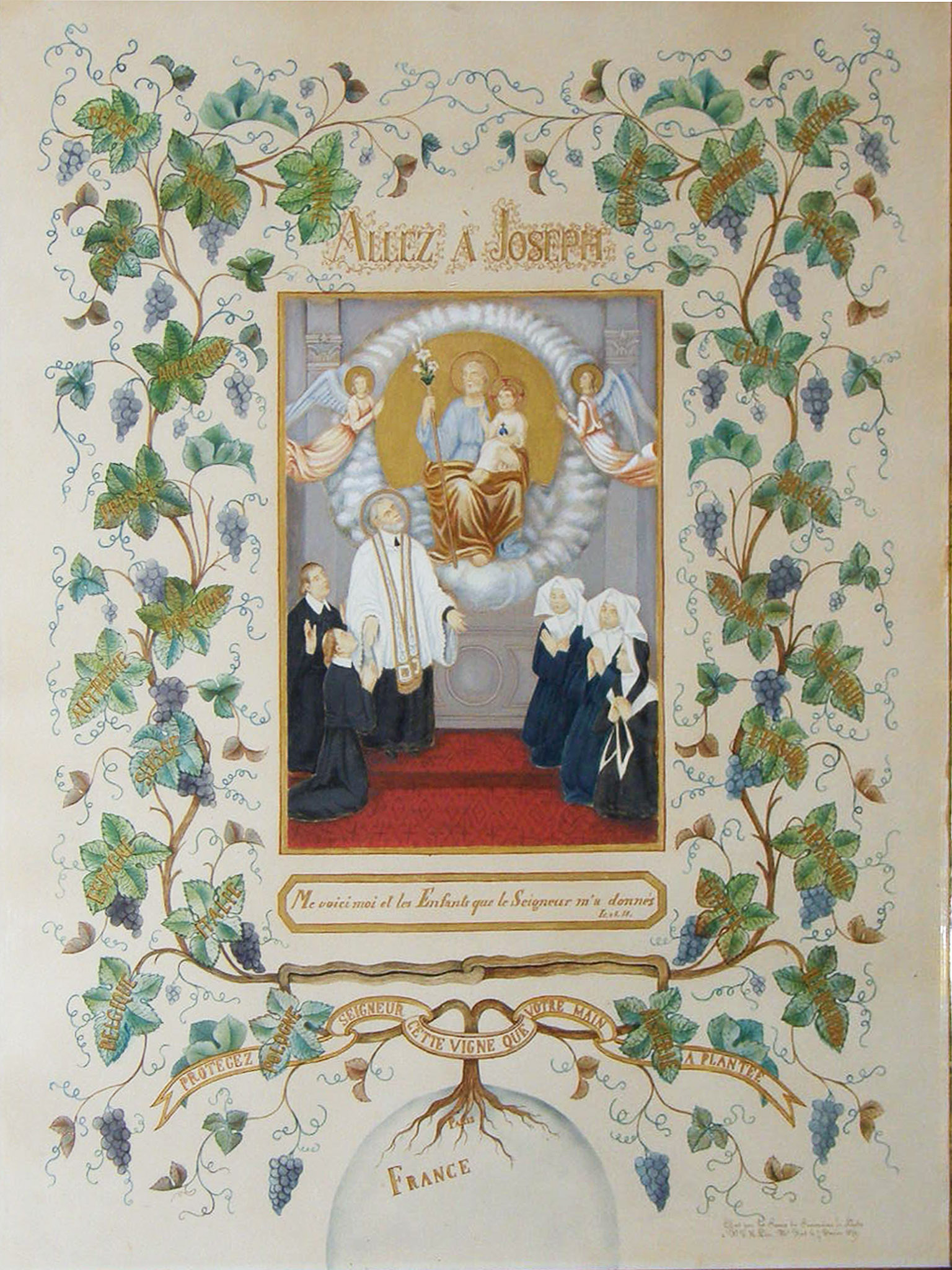 Gift to Antoine Fiat, superior general, with vine growing and clusters identified as provinces of Daughters of Charity; Vincent de Paul, standing, cassock, surplice, stole, presenting the two communities to St. Joseph and Jesus